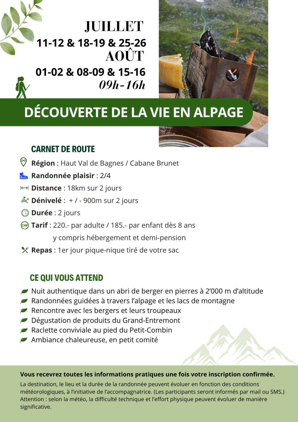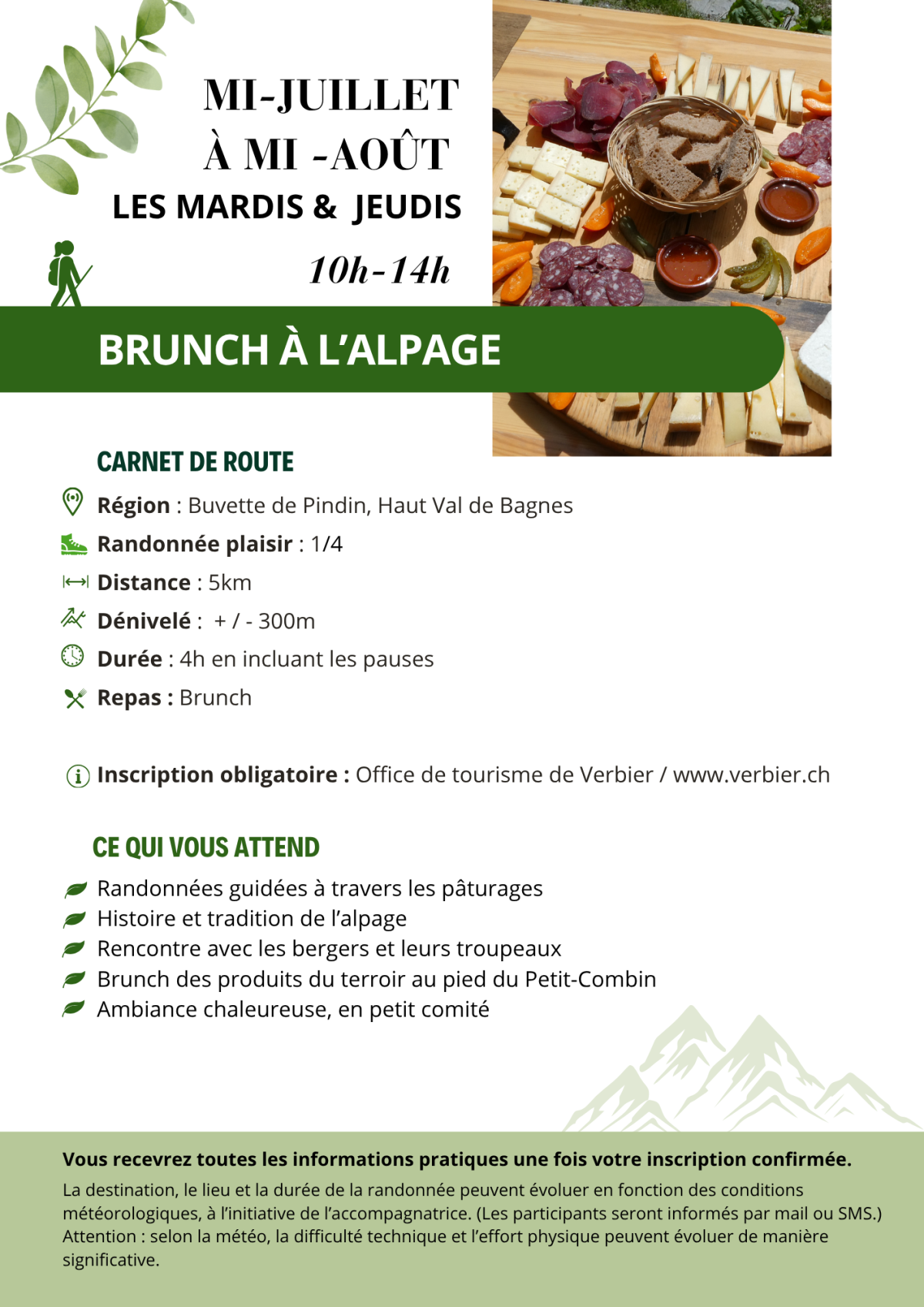 Randonnée à travers les pâturages de l’alpage pour découvrir le mode de vie ancestral des alpages, à la rencontre des vaches d’Hérens avec une dégustation d’un plateau du terroir à la buvette de Pindin.