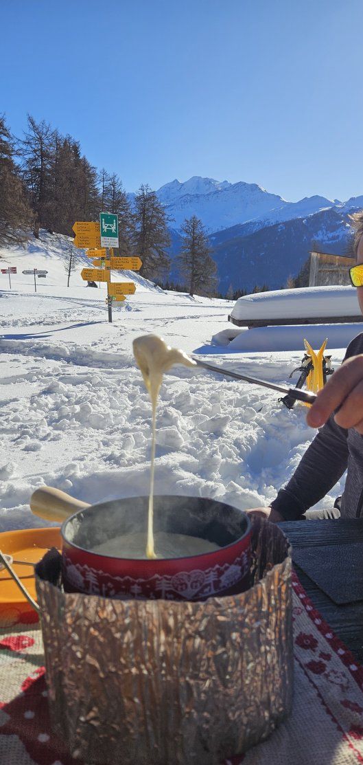 Au bout du chemin : une pause gourmande autour d’une fondue partagée en pleine nature.