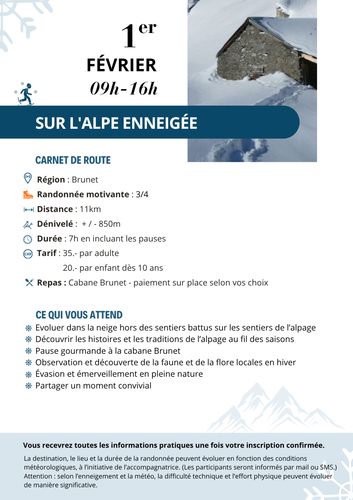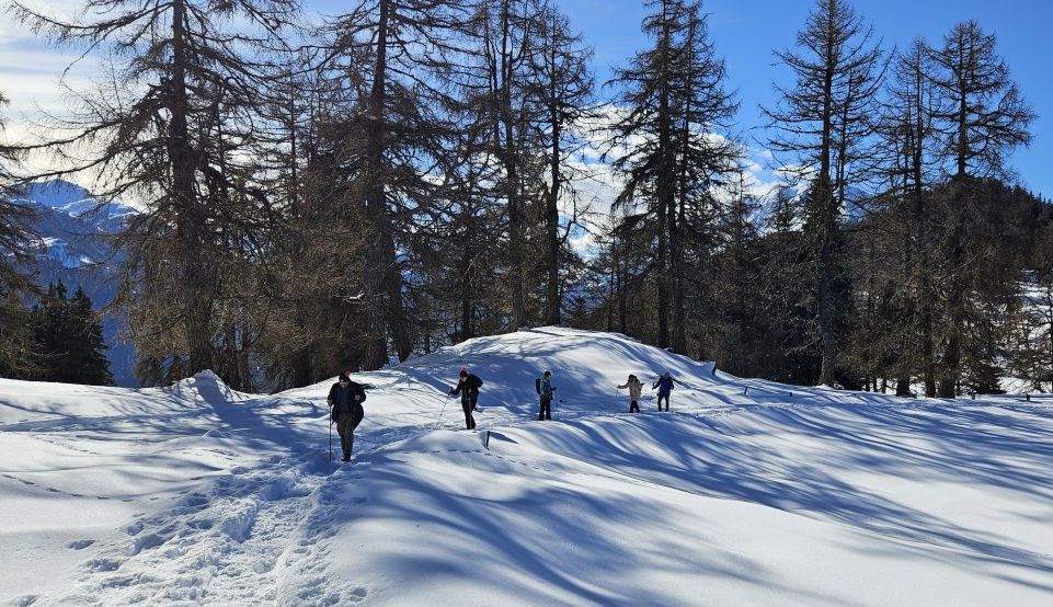 Une échappée hivernale en raquettes à travers l’alpage de Sery-Laly, au cœur du Haut Val de Bagnes, cette randonnée en raquettes vous mène jusqu’à la cabane Brunet pour un moment gourmand. Forêts enneigées, silence profond et nature intacte : une journée hors du temps, loin de toute connexion.