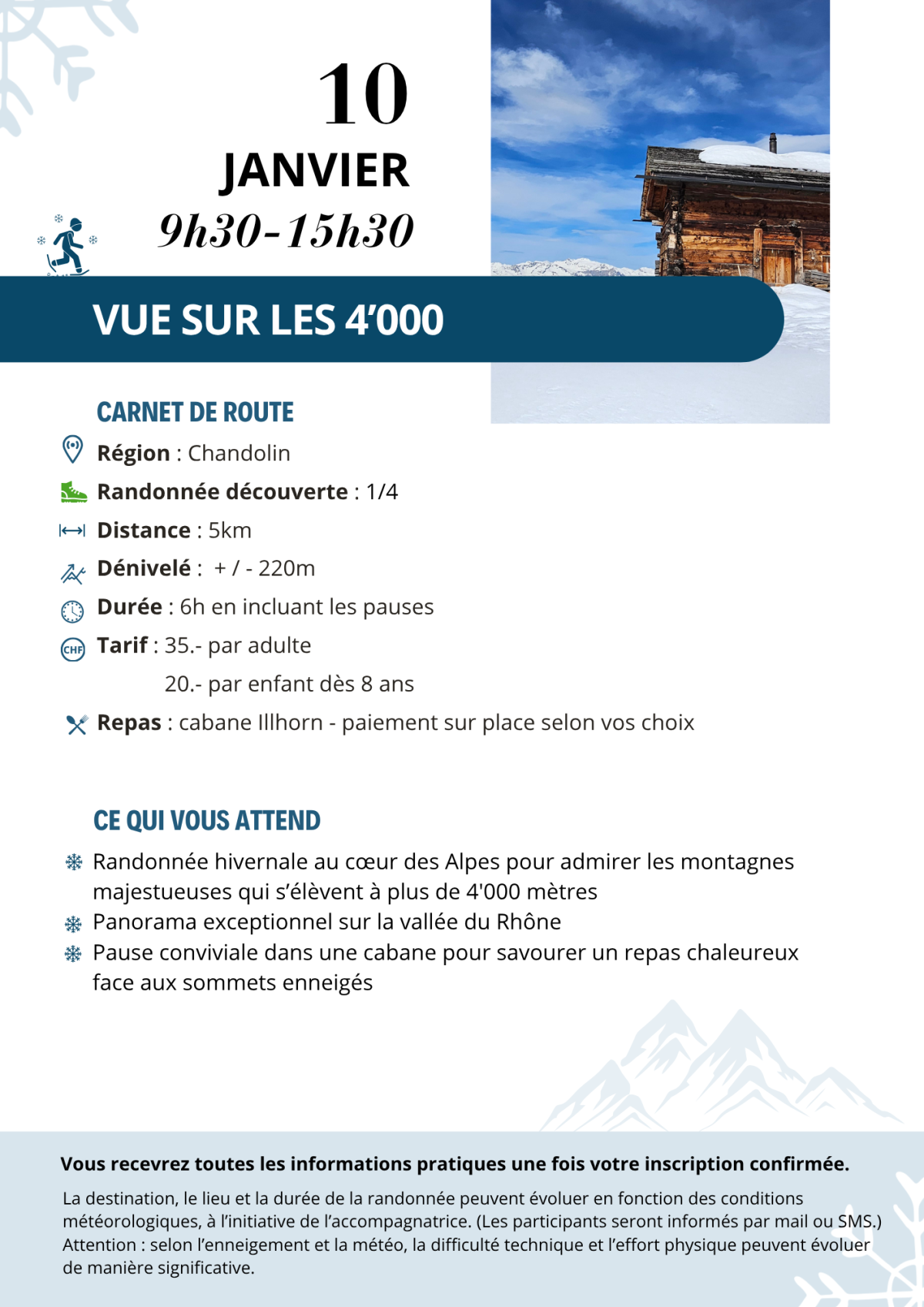 Au cœur des Alpes, laissez-vous émerveiller par les montagnes majestueuses qui s’élèvent à plus de 4 000 mètres. Avec cette randonnée, profitez de l’hiver pour contempler leur somptueux manteau blanc, véritable joyau de la saison.