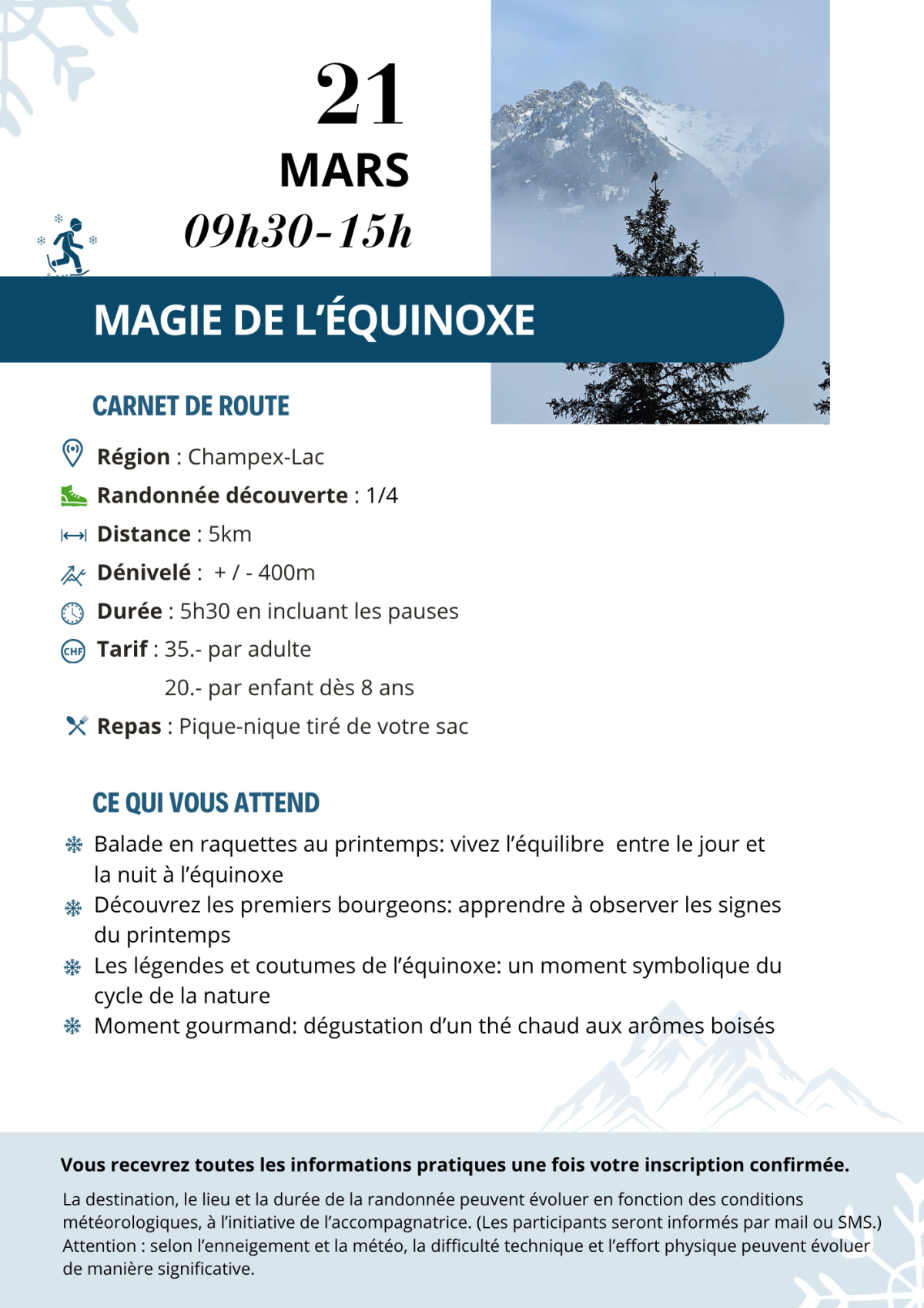 À l’aube du printemps, partez en raquettes sur des sentiers encore enneigés et vivez la magie de l’équinoxe, entre jour et nuit en équilibre. Forêts scintillantes, silence et air frais vous accompagnent. Au détour du chemin, observez les premières pousses percer la neige fondante, signe fragile du renouveau de la nature.